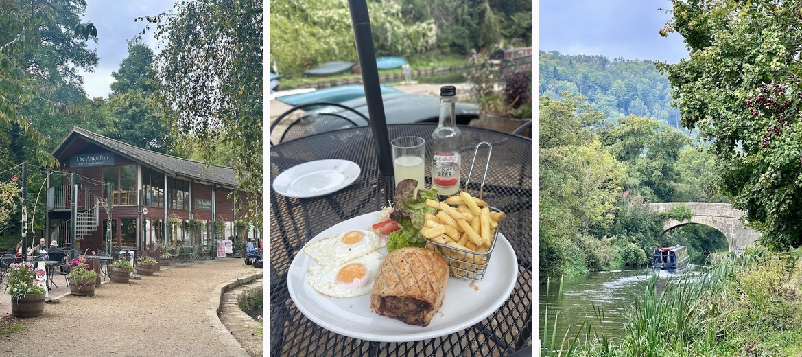 The Angelfish is located at Canal Visitor Centre, Brassknocker Hill, Monkton Combe, Bath BA2 7JD, United Kingdom, right next to the scenic Somerset Coal Canal.